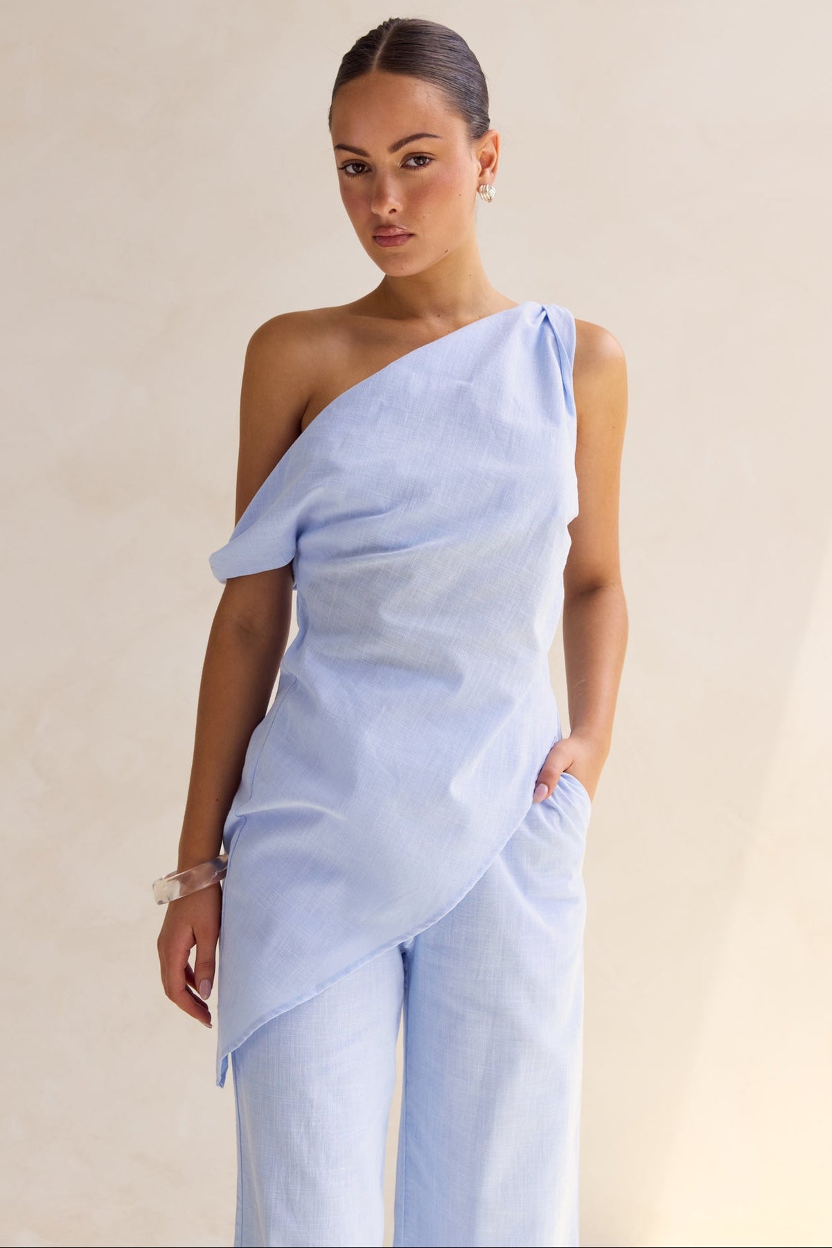 • One-shoulder top with a draped and asymmetrical wrap design