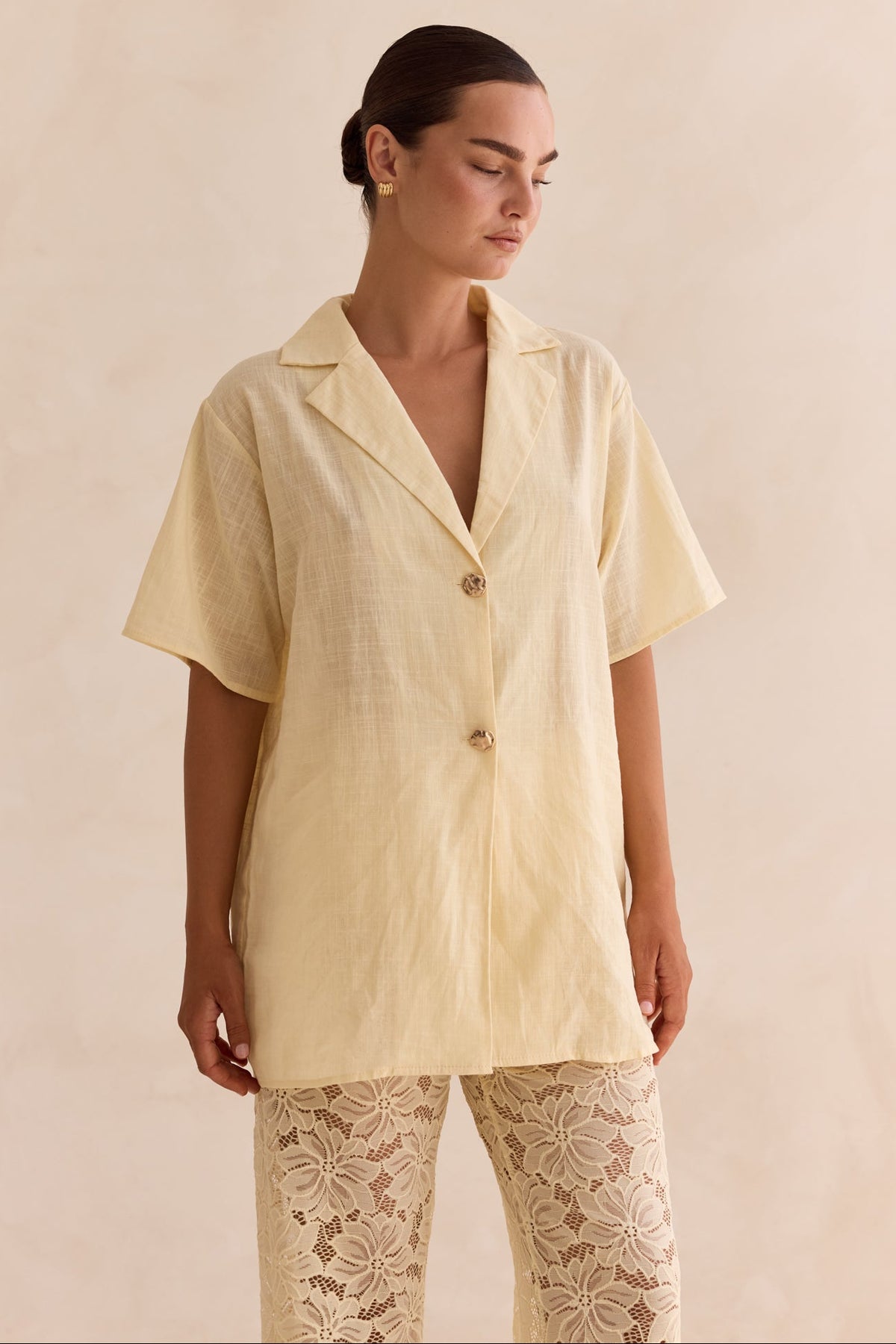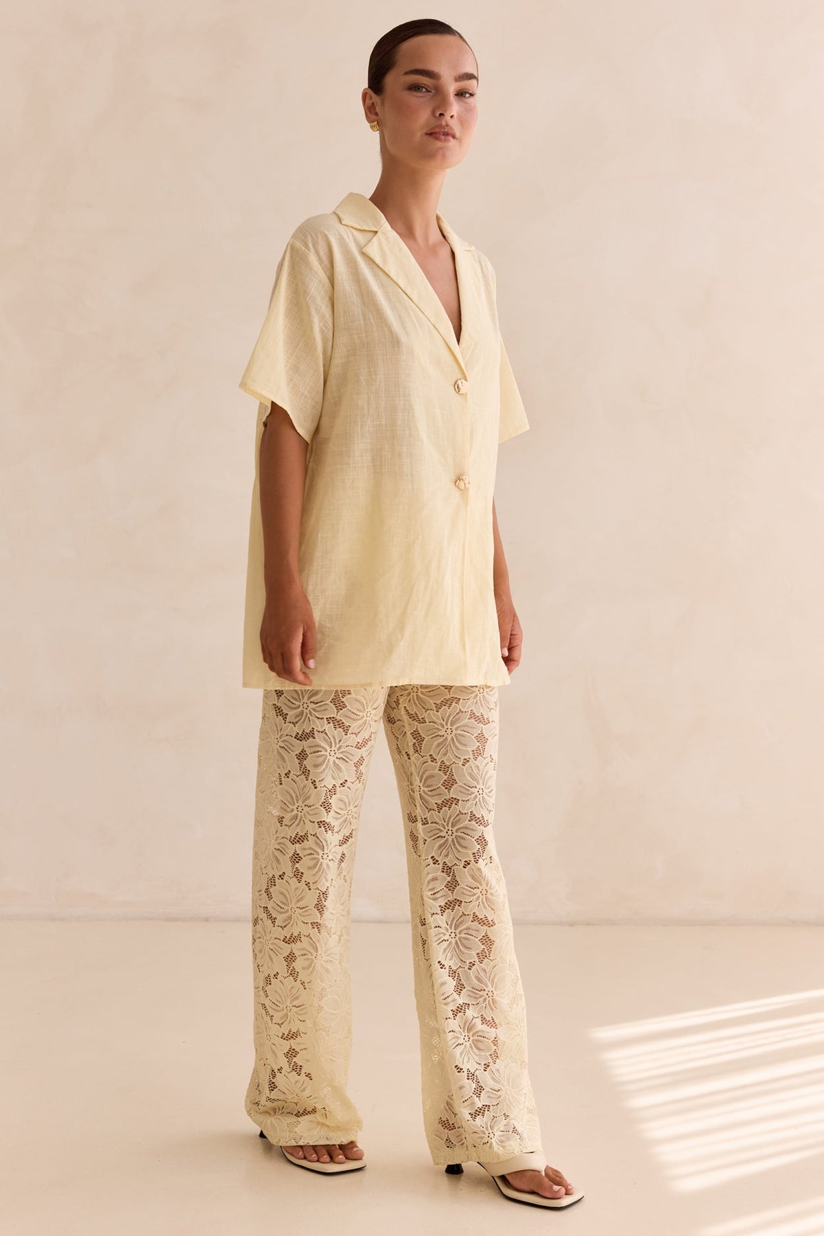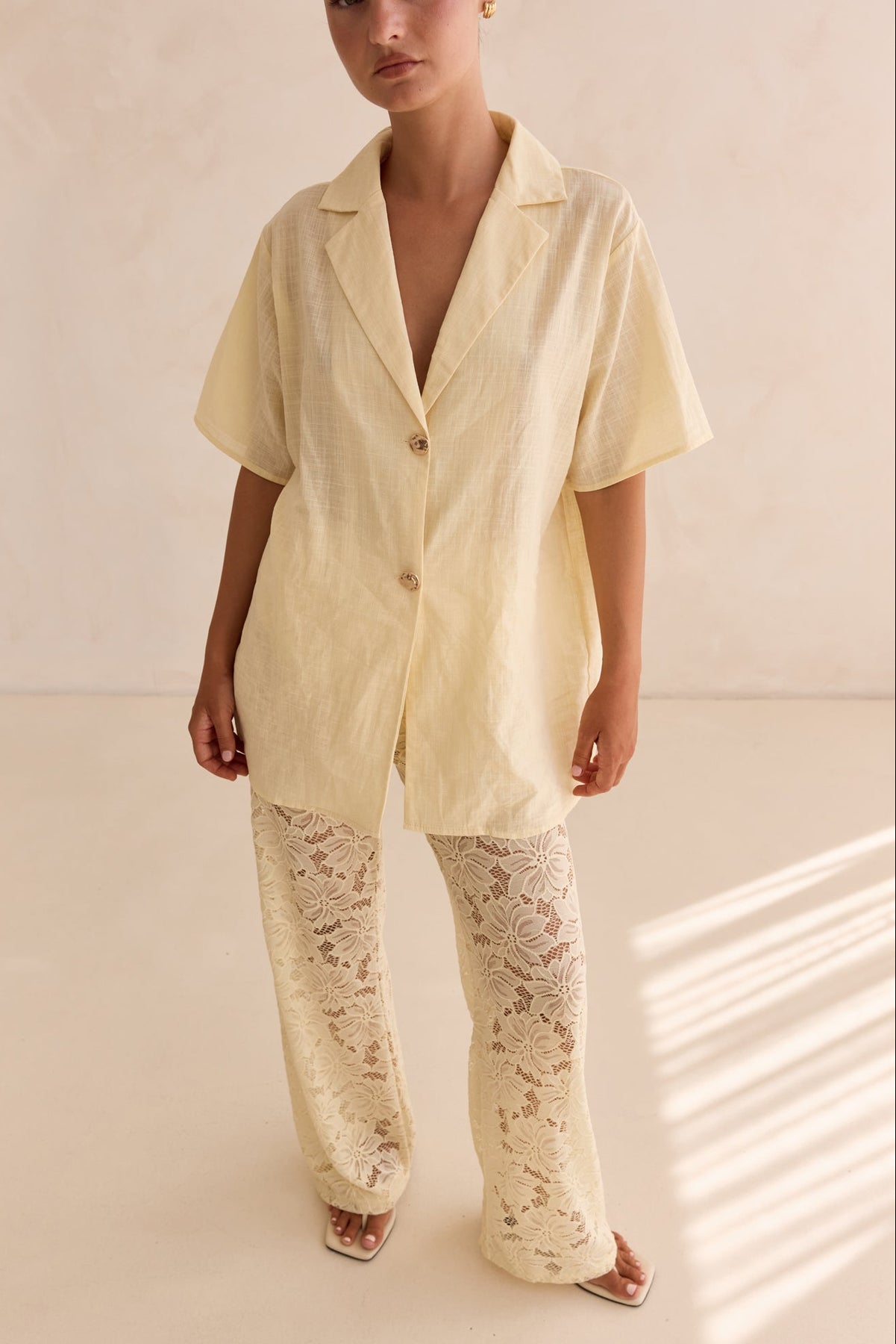 • Cotton shirt and lace pant set in yellow (sold as a set)